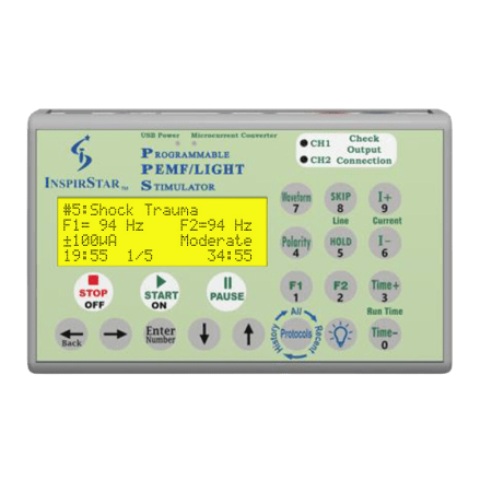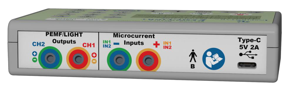 PEMF Output: F1 + F2 to CH1, CH2, or both CH1 & CH2. The output is user-configured.